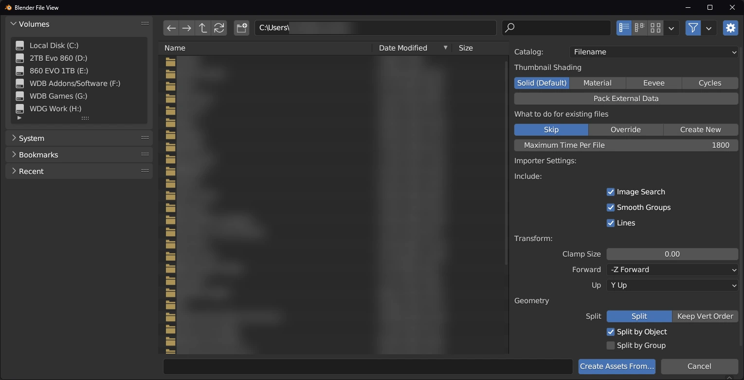 Once you select this option, a blender file viewer will open. From here you need to either select a directory with FBX files in, OR select an FBX file. TrueASSETS can auto-import multiple files by recursively searching through sub-directories for the requested file types; just navigate to a directory that has sub-directories in with the needed files and then finish the process.