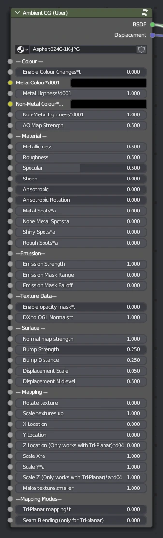 The AmbientCG Uber Shader is a versatile shader designed to handle a wide range of material properties. It offers comprehensive controls for color adjustments, material settings, emission, texture data handling, surface properties, and mapping modes.