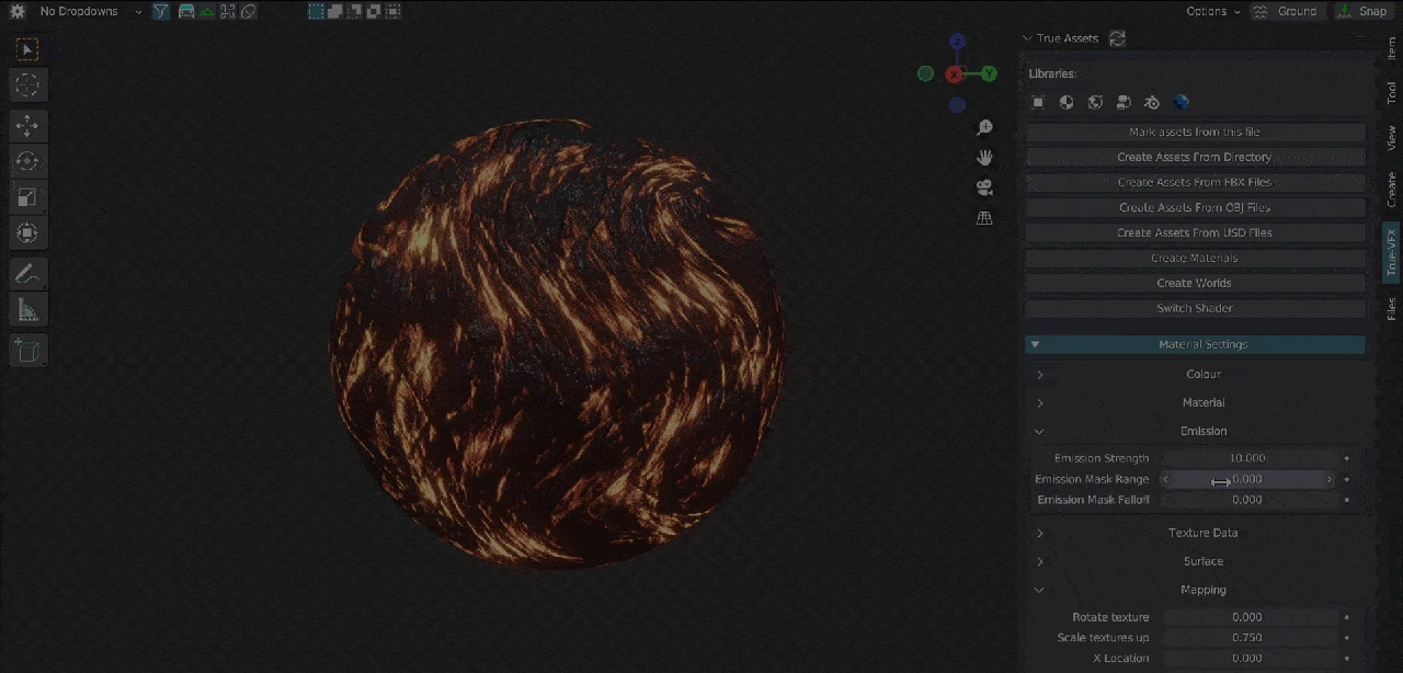 Adjusting this parameter determines the strength of the emission effect. Higher values result in a brighter emission, while lower values create a dimmer emission.