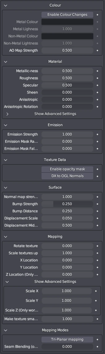 The shader is broken up into 7 distinct sections, in the UI using drop-down functions. This is to make the UI cleaner and allow the user to close information that is not needed. If you view this in the shader-editor, or the material properties, it will not look like the image on the left but will look like this: