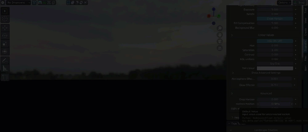 The True-HDRI World Shader is a versatile shader designed for various worlds. It offers controls for strength, blur, horizon, exposure, and mapping adjustments.