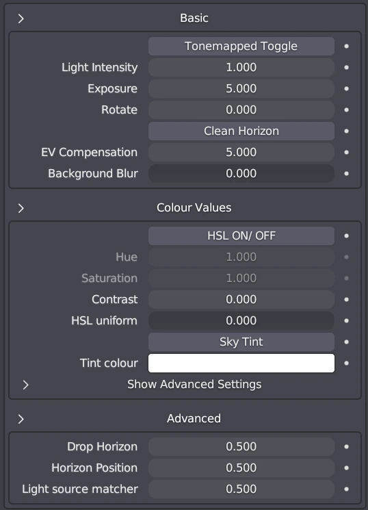 The shader is broken up into 4 distinct sections, in the UI using drop-down functions. This is to make the UI cleaner and allow the user to close information that is not needed. If you view this in the shader-editor, or the material properties, it will look like the image below (True-HDRI):